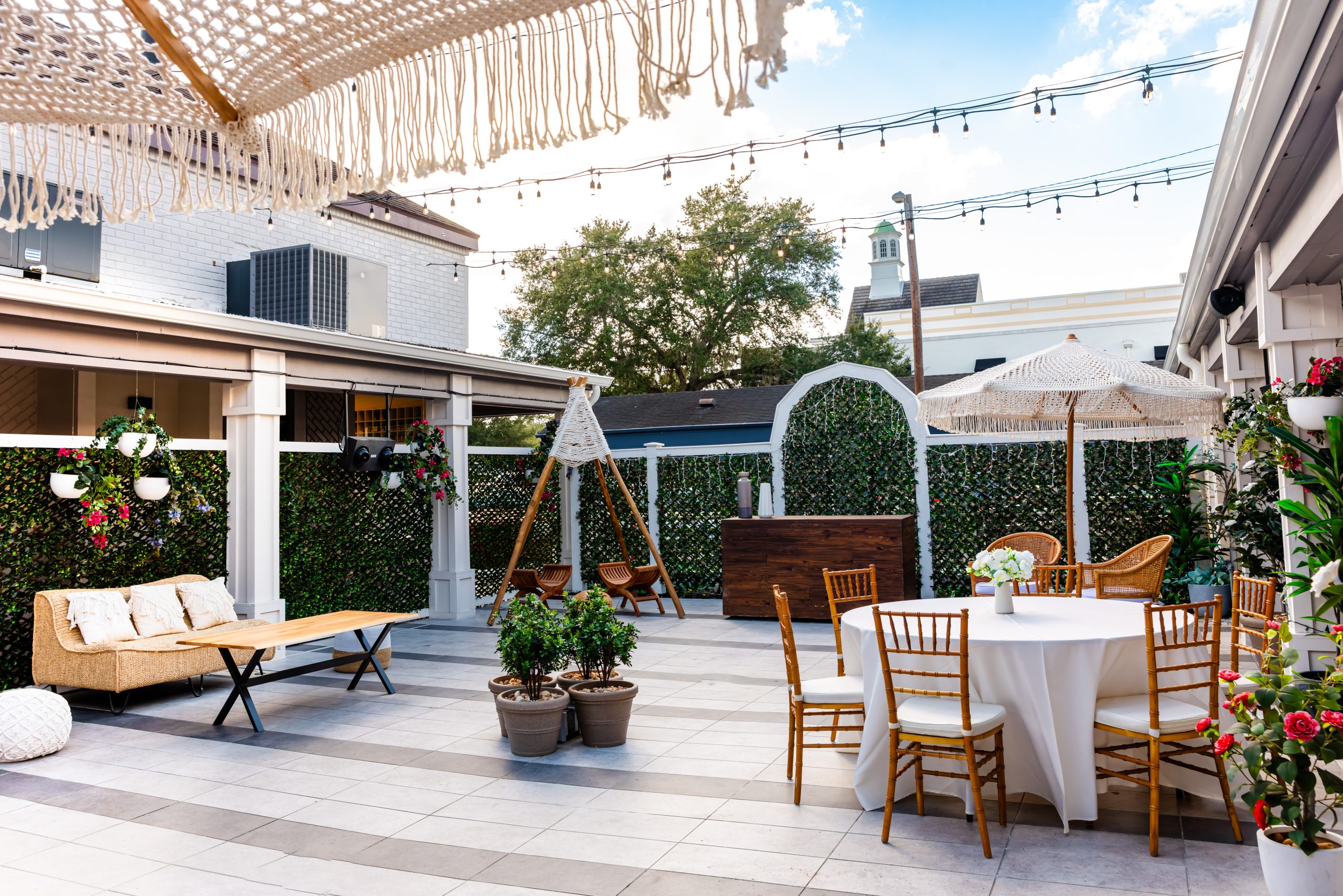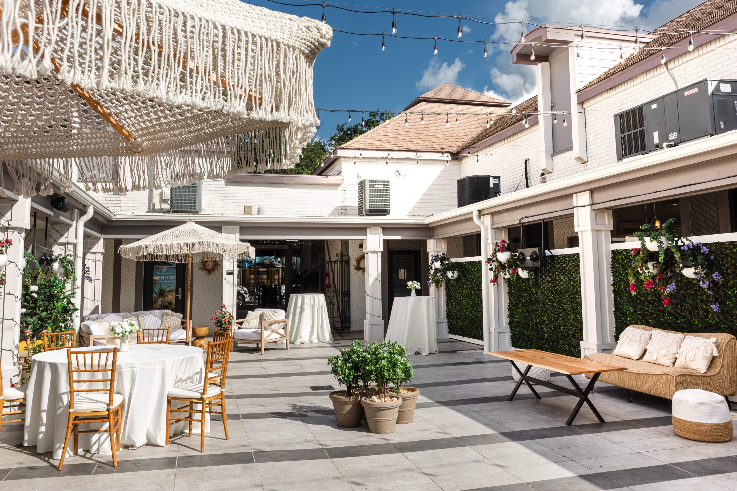 The courtyard is open-air with market lighting and lush greenery, while the adjacent breezeway offers partial coverage. We recommend a tent for full weather protection if needed.