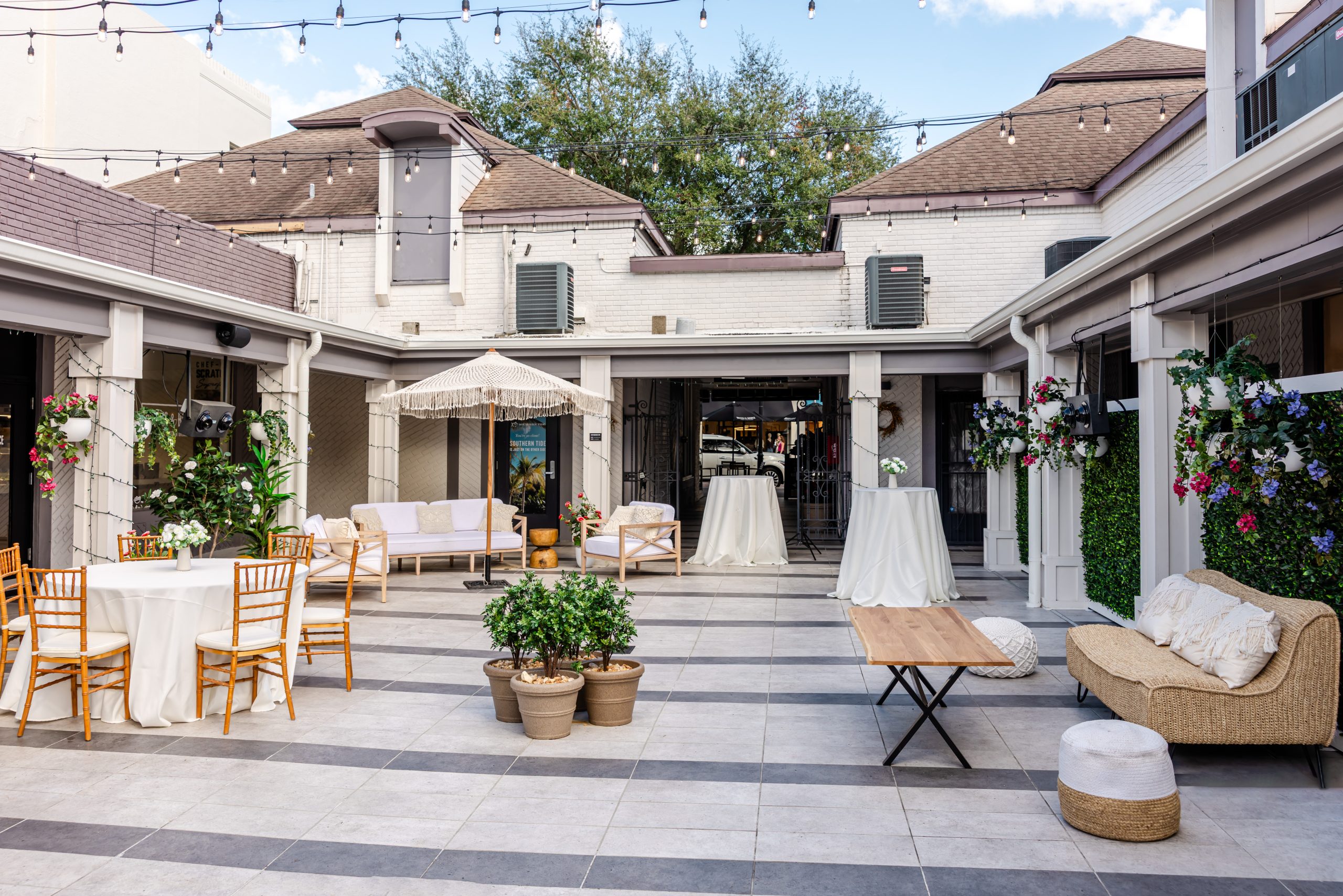 All rentals include exclusive use of the courtyard and breezeway, ambient lighting, optional access to our in-house catering team, and an on-site coordinator to assist during setup and breakdown.